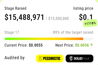 これまでのところ、半分になり、15万ドル以上を調達し、$XYZトークンの価格は現在 ドル0,0055. プレセールの次の段階では、$XYZトークンの価値はさらに上昇し、 ドル0,0056 つまり、早期投資家はより大きな割引を確保するチャンスを得ることになる。